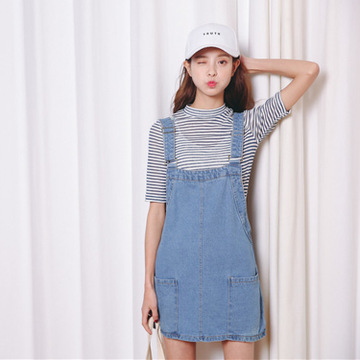 2016夏季新款 學(xué)院風(fēng)大口袋牛仔背帶短裙 /