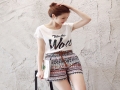 2016夏圓領(lǐng)字母圖案雪紡衫 復(fù)古印花亞麻短褲時(shí)尚兩件套配腰帶 /