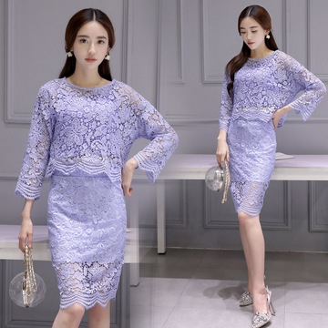 韓版時(shí)尚216夏季圓領(lǐng)九分袖蕾絲衫勾花鏤空修身包臀裙顯瘦兩件套 /