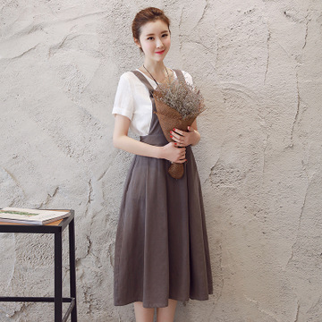 2016夏季新款簡(jiǎn)約文藝亞麻修身襯衫 純色背帶長(zhǎng)裙時(shí)尚兩件套 /