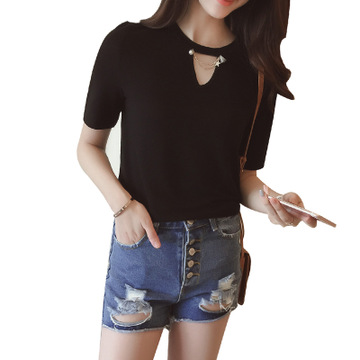 夏季新款韓版寬松潮流百搭流蘇V領(lǐng)鏤空打底女式T恤衫 /