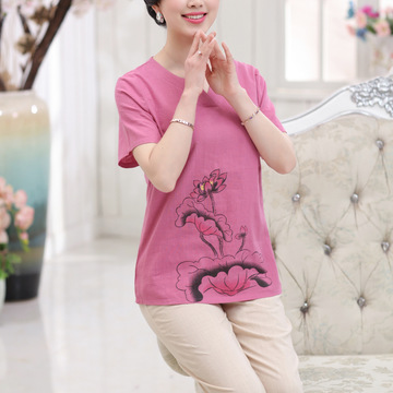 清倉(cāng)大碼中老年女裝新款夏裝套裝 棉麻繡花短袖T恤 民族風(fēng)媽媽裝 /