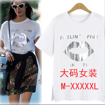 歐洲站 胖MM最愛 嘴唇印花大碼女裝圓領(lǐng)短袖T恤 /