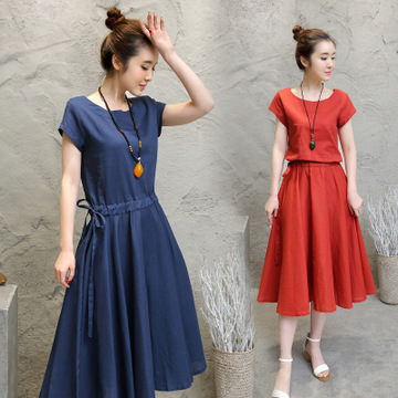 1531實拍夏大碼女裝中長款收腰顯瘦短袖棉麻連衣裙夏季亞麻長 /