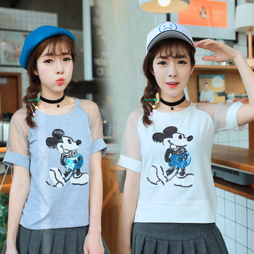 實(shí)拍韓版短袖t恤女寬松上衣創(chuàng)意刺繡網(wǎng)紗修身百搭夏裝卡通潮 /