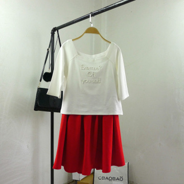 專柜單 2016夏裝修身連衣裙女廓型一字領(lǐng)中袖短款T恤+百褶半身裙 /