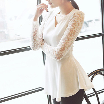 韓版蕾絲長(zhǎng)袖雪紡衫修身顯瘦v領(lǐng)上衣中長(zhǎng)款氣質(zhì)蕾絲衫女 /
