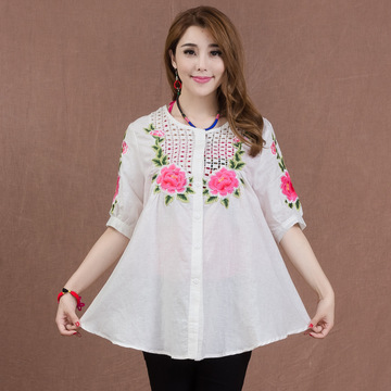 寬松棉麻刺繡女裝民族風(fēng)鏤空刺繡花襯衫大碼休閑寬松中袖上衣女 /