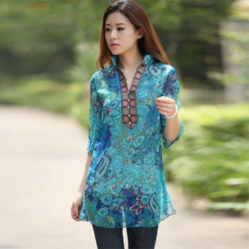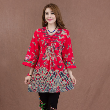 新款民族風(fēng)棉麻女裝印花修身V領(lǐng)喇叭袖襯衫中長(zhǎng)刺繡中國(guó)風(fēng)上衣女 /