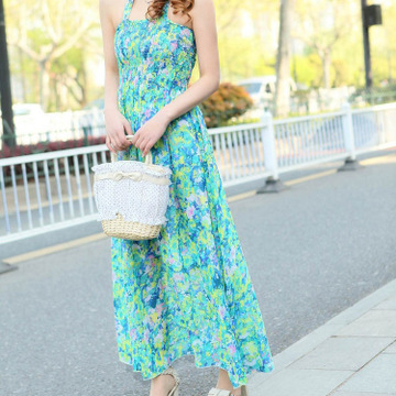 2015夏新款田園風雪紡連衣裙 抹胸吊帶設(shè)計 夏日清涼百褶裙女裙子 /