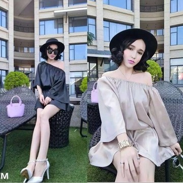 實(shí)拍~2016新春款性感一字領(lǐng)單肩喇叭袖大擺連體褲套裝 /