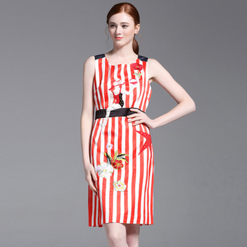 2016春夏新款歐美走秀款人物刺繡花紅色豎條紋無(wú)袖背心連衣裙女 /