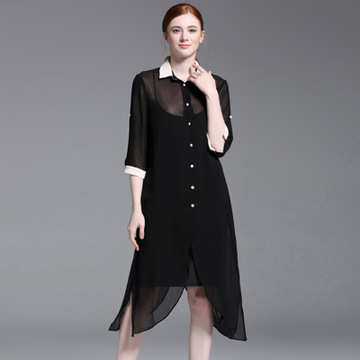 2016春夏新款女歐洲站透視連衣裙大碼薄款襯衫裙翻領(lǐng)中長(zhǎng)襯衣 /