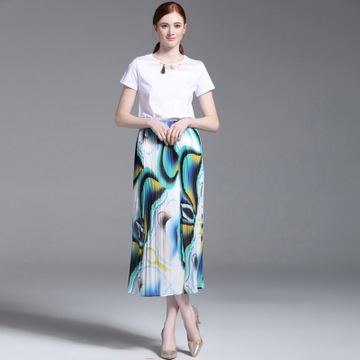 2016女裝春夏季裙子新款歐美長(zhǎng)款百褶裙高腰印花長(zhǎng)裙半身裙女 /