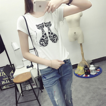 2016夏季新品 女式圓領(lǐng)短袖棉T恤 貓咪圖案 一件代發(fā) 批發(fā) /