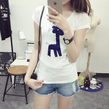 2016夏季圓領(lǐng)修身卡通小鹿亮片棉質(zhì)白色青年學(xué)生女短袖T恤批發(fā) /