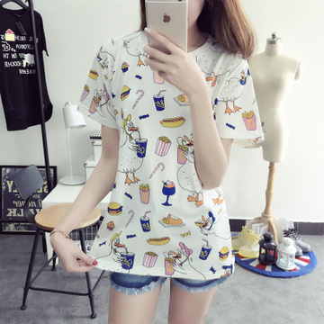 2016春夏圓領(lǐng)套頭卡通印花寬松白色青年學(xué)生女T恤短袖一件代發(fā) /
