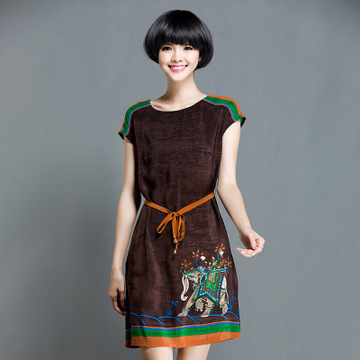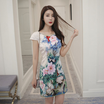 2016年夏季女裝新款 復古時尚印花修身顯瘦圓領(lǐng)短袖連衣裙旗袍裙 /
