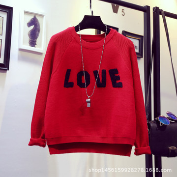 秋冬新款韓版時(shí)尚寬松大碼短款LOVE字母圖案針織衫套頭毛衣 女 /