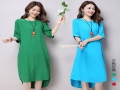 2016夏季新款女裝原創(chuàng)復(fù)古短袖竹節(jié)棉麻中裙連衣裙長(zhǎng)裙 /