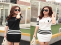 模特實(shí)拍2016夏秋韓版徽章時(shí)尚套裝條紋修身針織衫包臀裙女 /