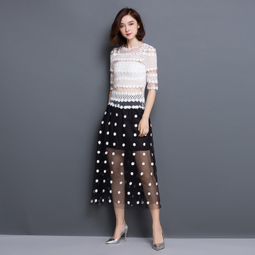 新款實(shí)拍兩件套蕾絲鏤空上衣+刺繡波點(diǎn)半身裙套裝兩件套 /