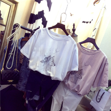 韓國單 清新文藝水洗棉抽象印花 梅花鹿和狼純棉短袖打底t恤女 /
