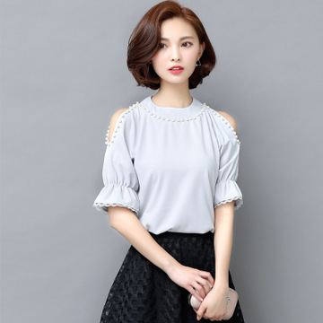 2016夏裝新款雪紡衫五分袖小衫百搭露肩訂珠喇叭袖上衣 /