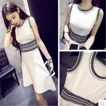 2016春夏新款復古修身顯瘦針織無袖中長款A字連衣裙 /
