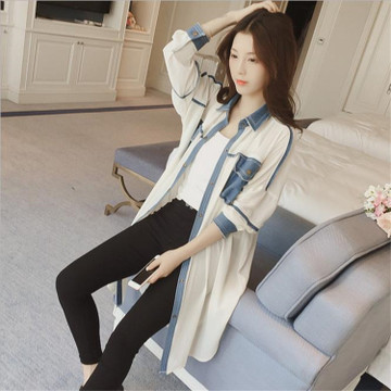 2016春夏季新款韓范寬松雪紡襯衫中長款牛仔拼接長袖防曬衣 /