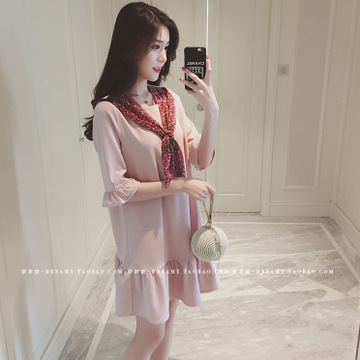現(xiàn)貨 2016夏季新款甜美拼接碎花雪紡絲巾系帶時尚孕婦連衣裙 /