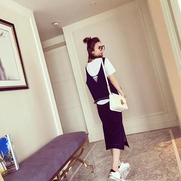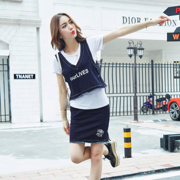 2016春夏新款時(shí)尚休閑牛仔背心T恤半身裙三件套套裝女 /
