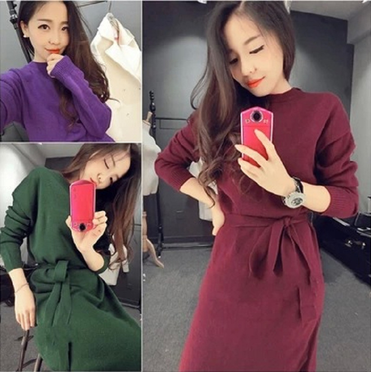 歐洲站秋款優(yōu)雅女裝腰帶圓領(lǐng)套頭毛衣裙長款針織連衣裙長裙女批發(fā) /