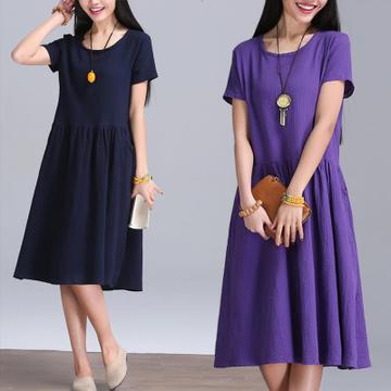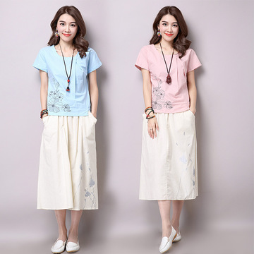 2016春夏韓版女裝短袖T恤棉麻連衣裙大碼兩件套亞麻顯瘦中長裙 /