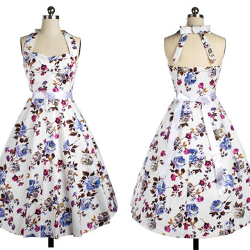 2015歐美秋季新款熱賣時尚印花蓬蓬裙 掛脖露背配腰帶大擺裙 /
