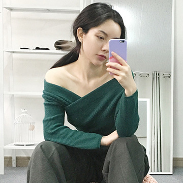 2016春裝高端定制性感名媛氣質(zhì)V領(lǐng)露肩兩穿毛衣針織衫 /