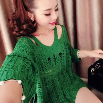 毛衫加工韓版毛衣定制性感V領(lǐng)露肩百搭長袖破洞寬松毛衣 一件代發(fā) /