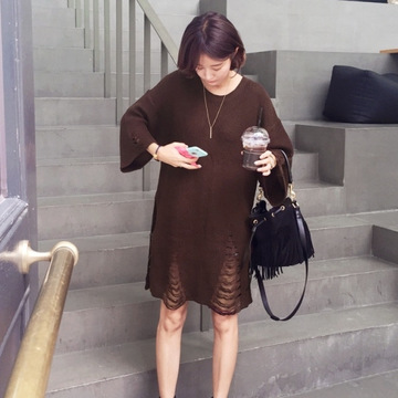 韓國代購2016春季新款時(shí)尚休閑側(cè)開叉鏤空磨破長款毛衣連衣裙 /