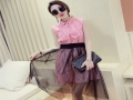 2016女裝新款夏裝無袖豎條紋襯衫網(wǎng)紗裙中長款兩件套名媛連衣裙 /