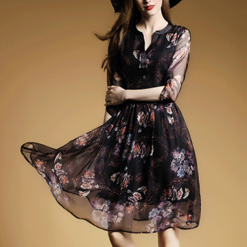 2016春裝新款女裝V領(lǐng)七分袖黑色通勤大擺雪紡印花連衣裙 /