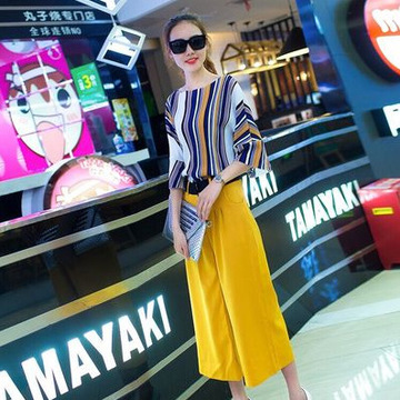 2016春夏女裝韓版時(shí)尚氣質(zhì)寬松條紋上衣+闊腿褲兩件套套裝女 /