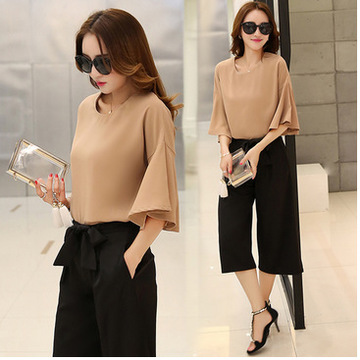 2016新款闊腿褲兩件套女裝春裝雪紡上衣七分褲時尚休閑套裝9916 /