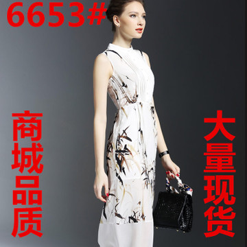 2016夏裝新款女復古氣質(zhì)無袖修身印花打底裙真絲連衣裙 /