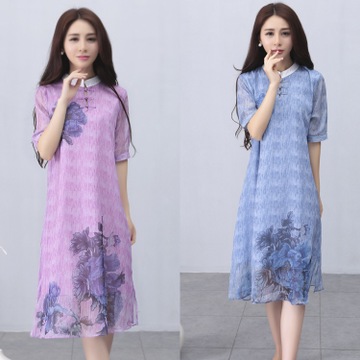 改良旗袍裙2016新款復古立領修身印花桑蠶絲真絲連衣裙女 /