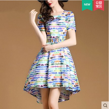 2016歐美夏裝新款女裝時(shí)尚彩色條紋圓領(lǐng)短袖連衣裙春夏款 /