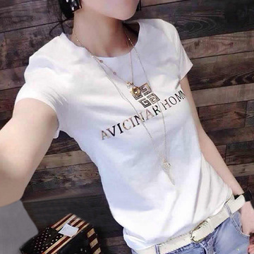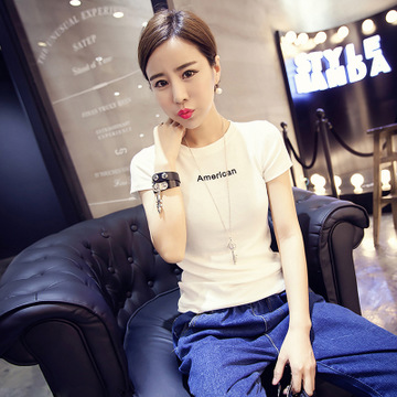 歐洲站2016夏裝大碼女裝圓領字母修身顯瘦體恤白色純棉短袖女t恤 /