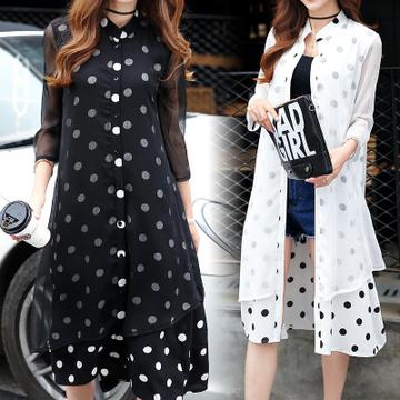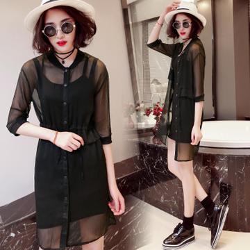 • 2016新款雪紡衫夏女裝 韓版時尚立領(lǐng)雙層長款七分袖開衫品牌正品 /