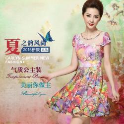 2016新款夏年輕媽媽裝大碼修身仙女裙圓領淑女印花連衣裙 /