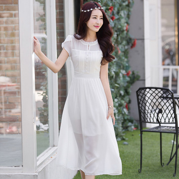 高檔女裝雪紡連衣裙韓版短袖中長款收腰修身純色性感夏裝裙子潮 /
