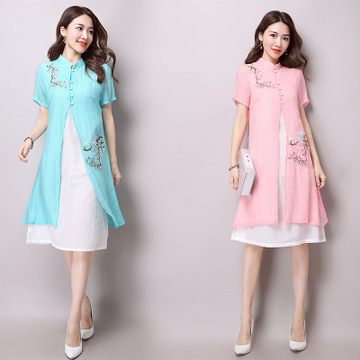 2016夏裝新款民族風(fēng)女裝刺繡短袖棉麻連衣裙 /